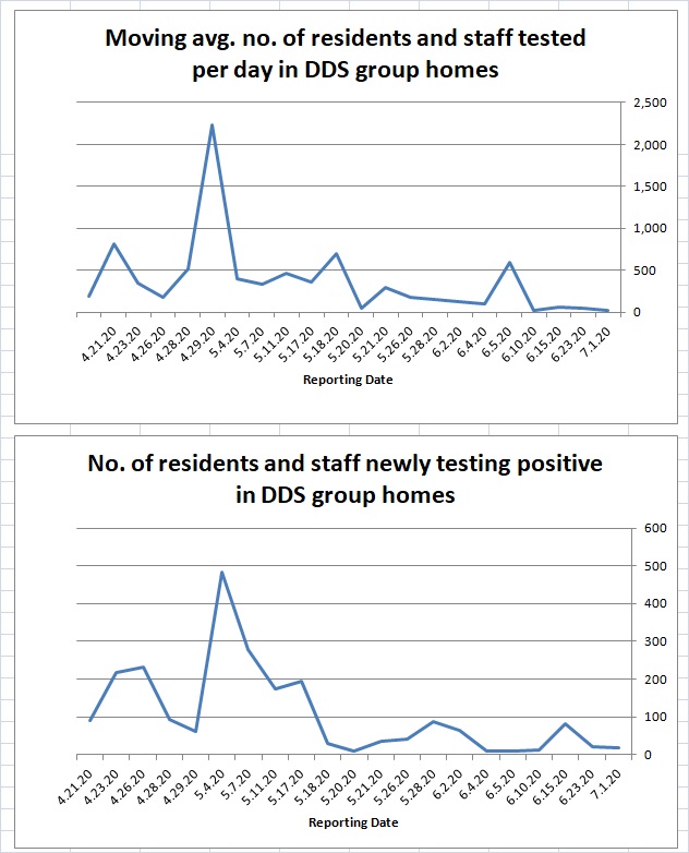 First, there appears to have been only a minimal level of testing done in the DDS system over the past month and a half, and virtually no on-site monitoring by DDS of the group home system. As I’ll discuss below, the downturn in testing since late May appears to correlate strongly with reporting by DDS of continuously lower numbers of new positive cases during that period.