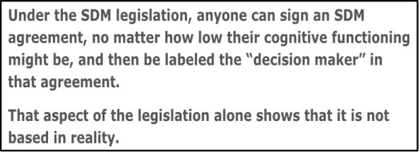 As a result, under the SDM legislation, anyone can sign an SDM agreement, no matter how low their cognitive functioning might be, and then be labeled the “decision maker” in that agreement. That aspect of the legislation alone shows that it is not based in reality.