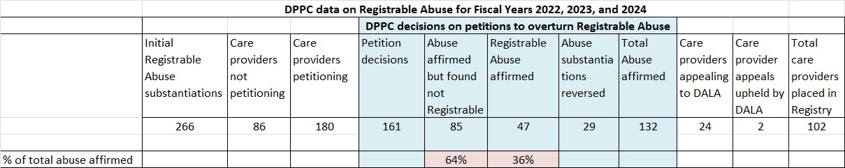 The data show that in only 36% of the cases in which DPPC affirmed initial substantiations of abuse allegations against care providers did the agency conclude that those persons’ names should be placed in the Registry. The DPPC data covered a three-year period since the database was first put into use in July 2021.
