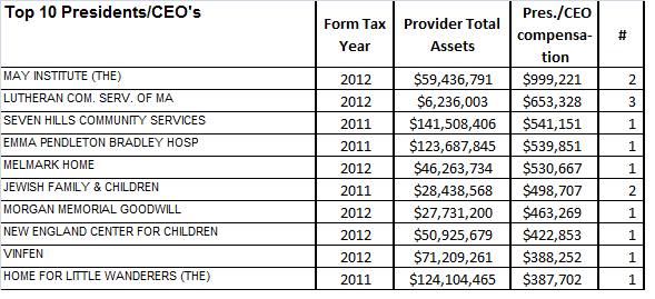 An OSD official maintained at the time that the state agency allows the state to pay costs in excess of the salary limit for clinicians working for providers. However, COFAR’s May 2011 post noted that all 13 May Institute employees who made over $150,000 were not listed on the IRS form as clinicians, but as executive-level employees, starting at senior vice presidents on up to the president and CEO.