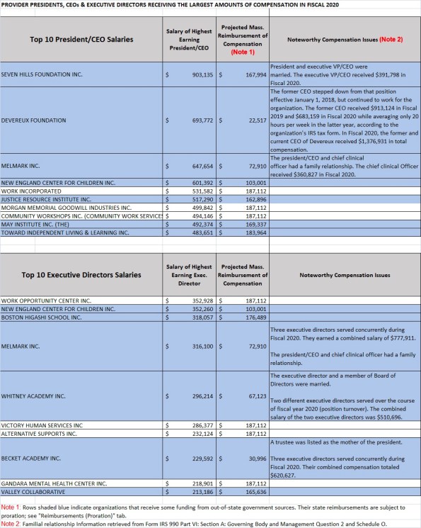 State regulations (808 CMR 1.05 (24) Salaries of Officers and Managers) limit state reimbursements to providers for the cost of compensating their executives. Limited executive compensation data for each provider and allowable reimbursement by the state are included in online UFRs.