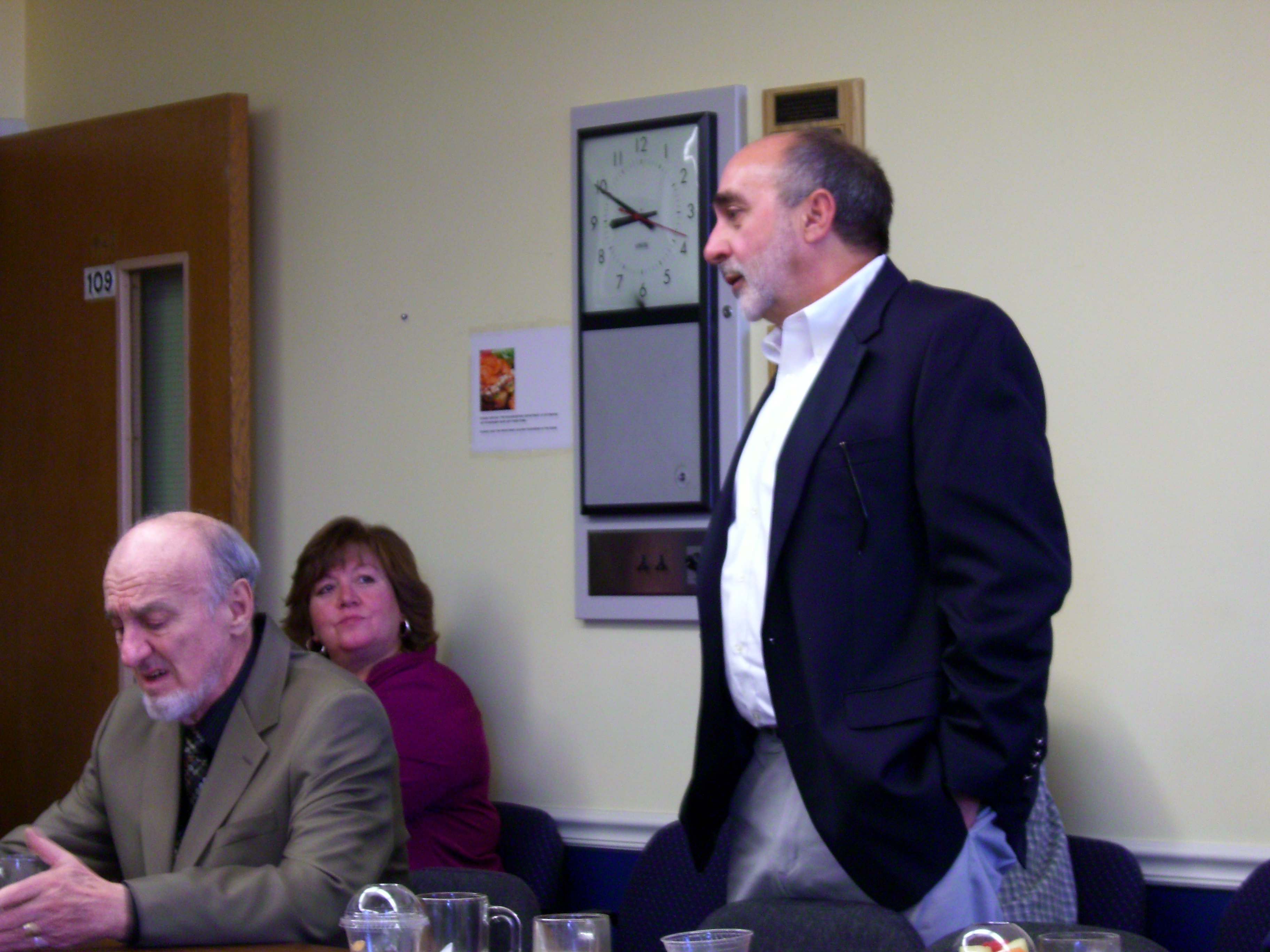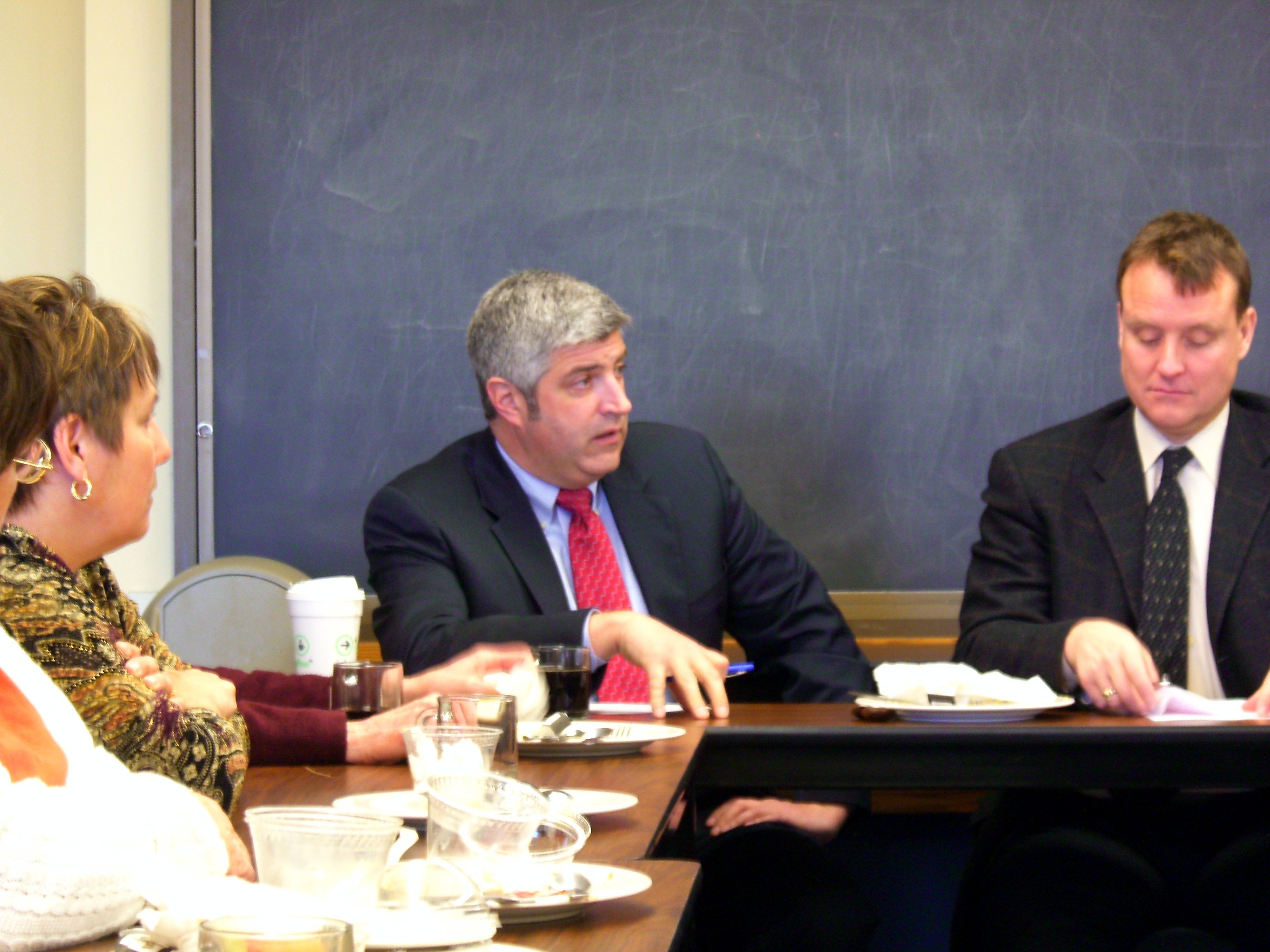 Rep. Anne Gobi (left), Rep. Vincent Pedone (center), and Senator Michael Moore (right) at Glavin breakfast. Moore said lawmakers will file a budget amendment calling for an independent analysis of the costs of closing three developmental centers.
